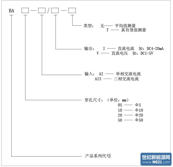 BA系列產品應用電磁感應原理,對電網中的交流電流進行實時測量,采用精密恒流技術和線性溫度補償技術,將其隔離變換為標準的直流信號輸出。采用24伏或12伏安全電壓供電,具有過載能力強、高精度、高隔離、高安全性、低功耗等特點,可廣泛用于工業自動化領域。 BA系列中剩余電流傳感器專用于漏電監控,監測電氣線路或電氣設備絕緣狀態,避免電氣線路或電氣設備絕緣性能降低引起的事故。 產品符合GB/T 13850-1998、GB 1208-2006 2 型號說明