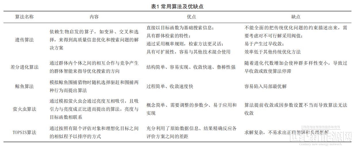 在確定目標函數(shù)和約束條件后,應選定適合的算法進行求取較優(yōu)解,常用的算法有:遺傳算法,差分進化算法;鯨魚算法;螢火 蟲算法;TOPSIS算法;雙層優(yōu)化算法。下面對幾種常用的算法的主要內(nèi)容以及優(yōu)缺點進行相應的比較,如上圖表1所示。 在對有序充電調(diào)度較為優(yōu)解進行求解的過程,目前研究使用的算法不盡相同。