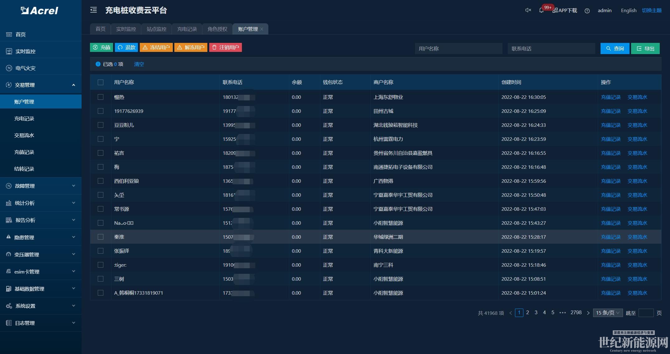 平臺管理人員可管理充電用戶賬戶,對其進行賬戶進行充值、退款、凍結、注銷等操作,可查看小區(qū)用戶每日的充電交易詳細信息。