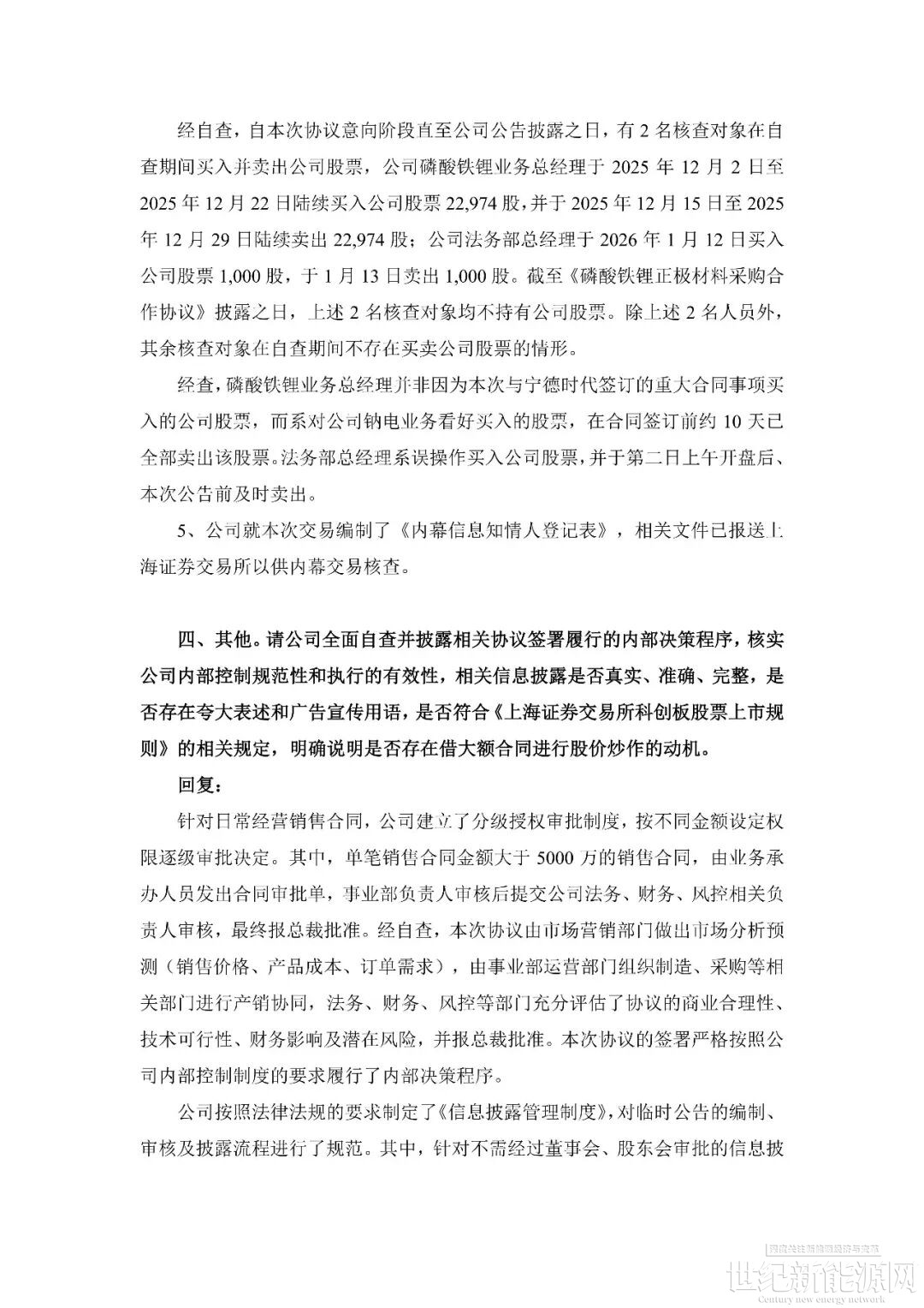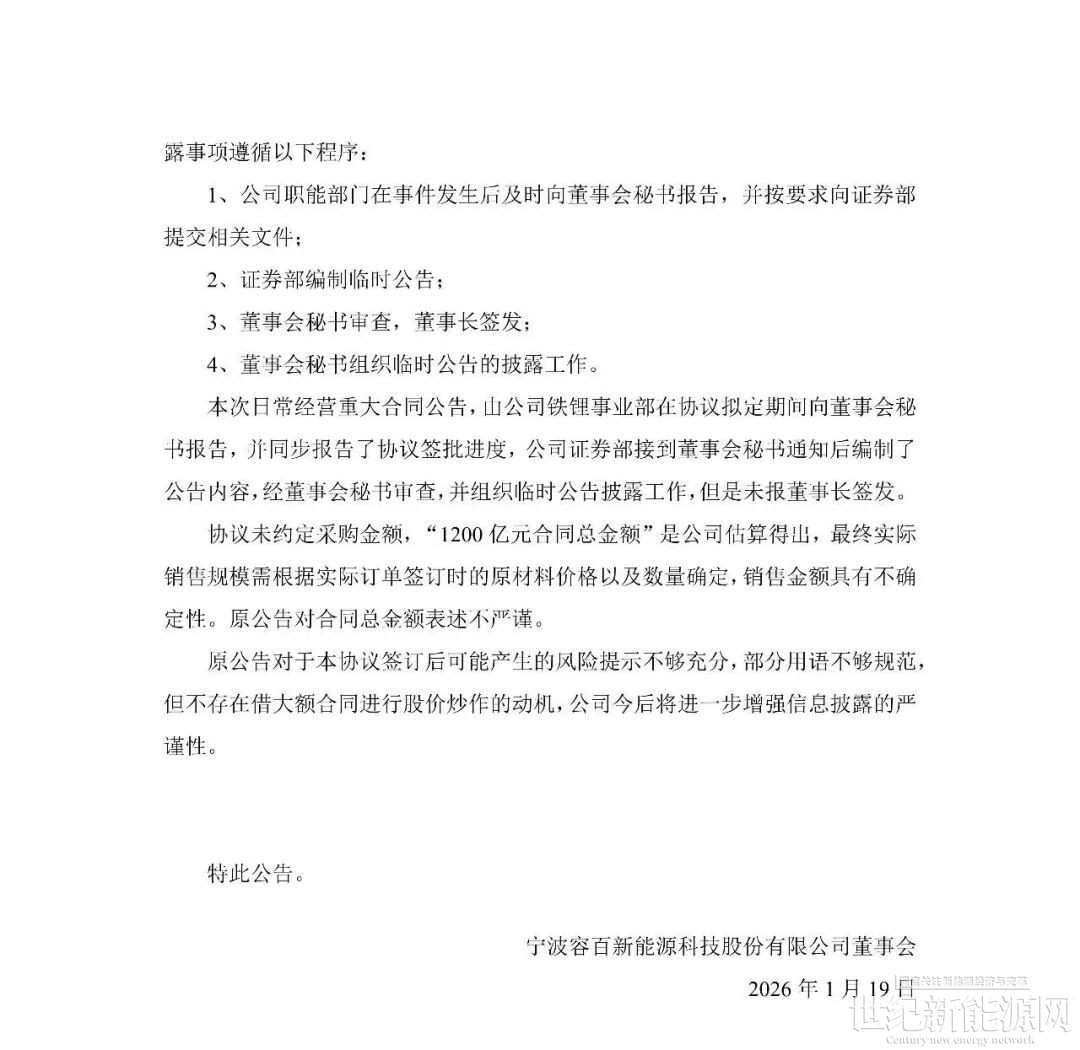 回顧事件發生過程。1月14日,容百科技公告披露,自2026年第一季度開始至2031年,將為寧德時代供應國內區域磷酸鐵鋰正極材料預計為305萬噸,協議總銷售金額超1200億元。公告當日,上交所火速下發問詢函,要求公司就信息披露準確性、協議具體內容、內幕信息管控等方面進行補充說明。