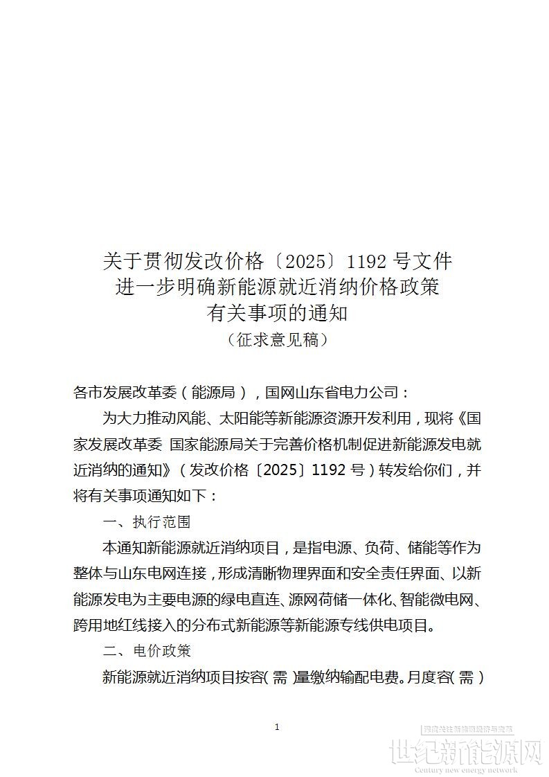 2月28日,山東省發改委發布關于公開征求《關于貫徹發改價格〔2025〕1192號文件進一步明確新能源就近消納價格政策有關事項的通知(征求意見函)》意見建議的公告。