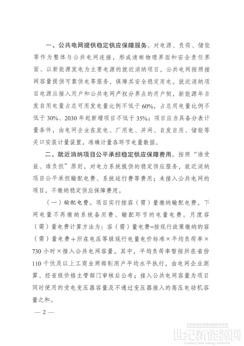 新能源就近消納項目按容(需)量繳納輸配電費。月度容(需)量電費=按現行政策繳納的容(需)量電費+所在電壓等級現行電量電價標準×平均負荷率×730小時×接入公共電網容量。其他電價政策按以下規定執行: