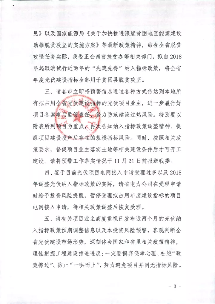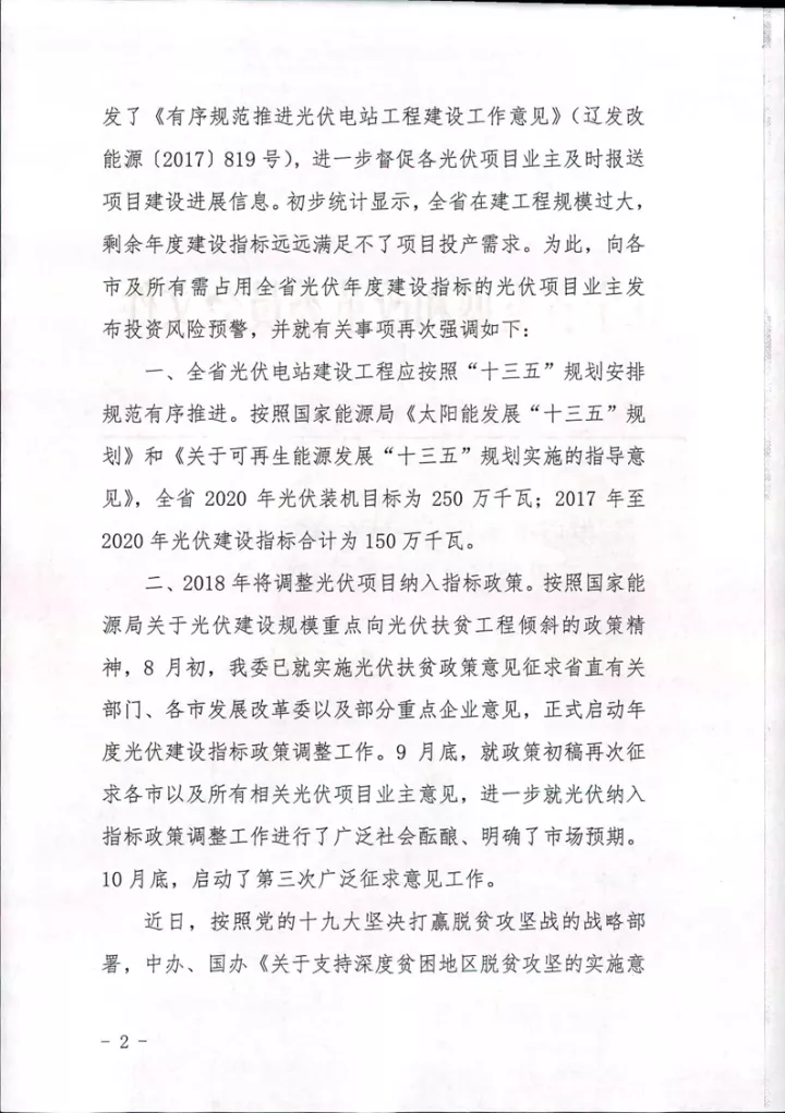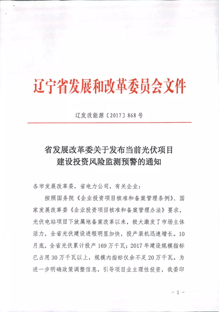 2017年11月20日,遼寧發(fā)改委發(fā)布《當前光伏項目建設投資風險監(jiān)測預警的通知》,通知中指出: