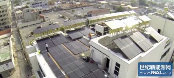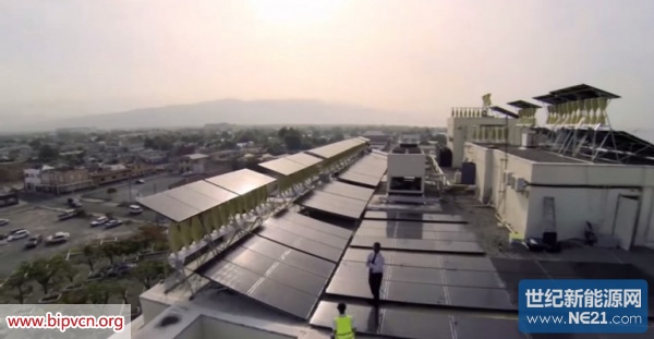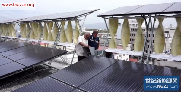 WindStream科技公司在牙買加港口城市金斯頓某辦公樓屋頂建成了據(jù)稱是全球最大的風(fēng)力-太陽能混合發(fā)電陣列系統(tǒng)。該系統(tǒng)運行后預(yù)計每年能產(chǎn)生106000千瓦時的電力。