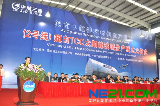 2011年1月24日, 中航三鑫股份有限公司所屬海南中航特玻材料有限公司高端玻璃生產(chǎn)基地2號線——日產(chǎn)600噸超白TCO太陽能玻璃生產(chǎn)線點(diǎn)火儀式在海南舉行。這是中國第一條大規(guī)模生產(chǎn)超白在線鍍膜TCO太陽能玻璃基片生產(chǎn)線。